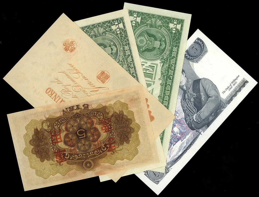 世界紙鈔一組5枚,包括1971-91年英倫銀行5元、1957年美國一元銀元券及2001年聯邦儲備券1元,日本1916年1元及1938年日本軍票5元,AU至UNC