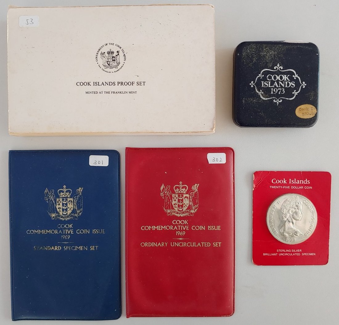 庫克群島及新西蘭錢幣共5組,包括精鑄幣3套及未流通錢幣2套,UNC,有霜化及膠漬,連原封套及證書