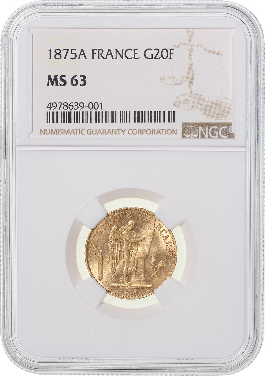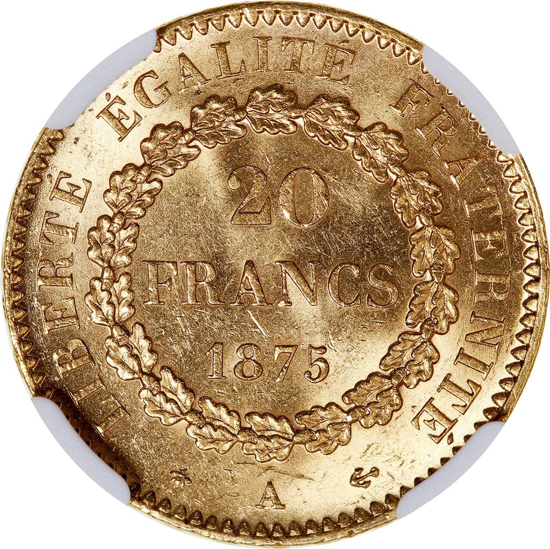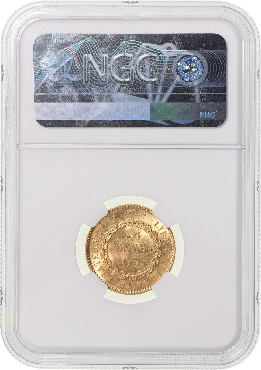 1875A法國20法郎金幣,含金量0.1867盎司,NGC MS63