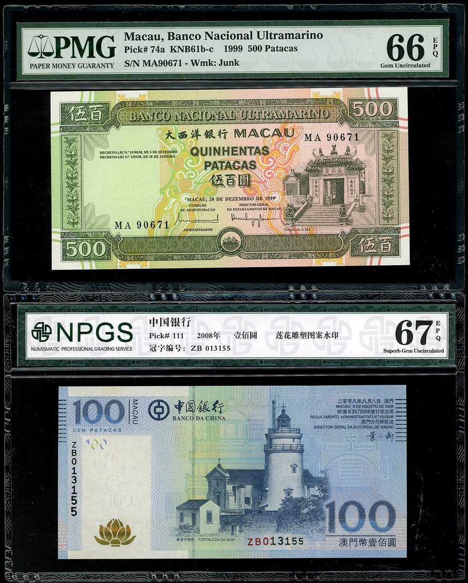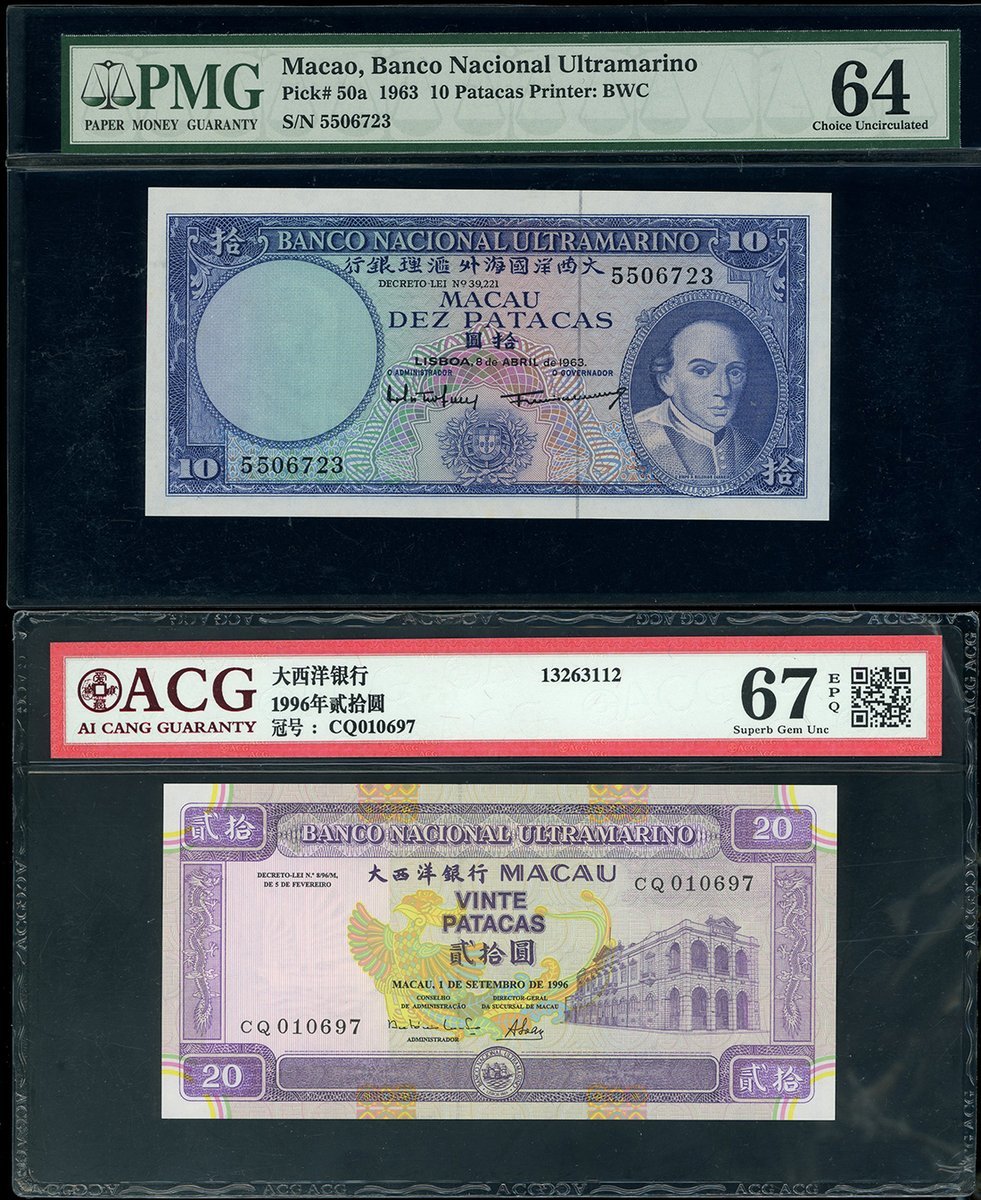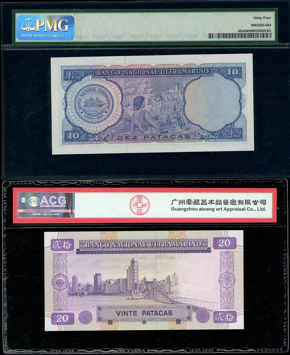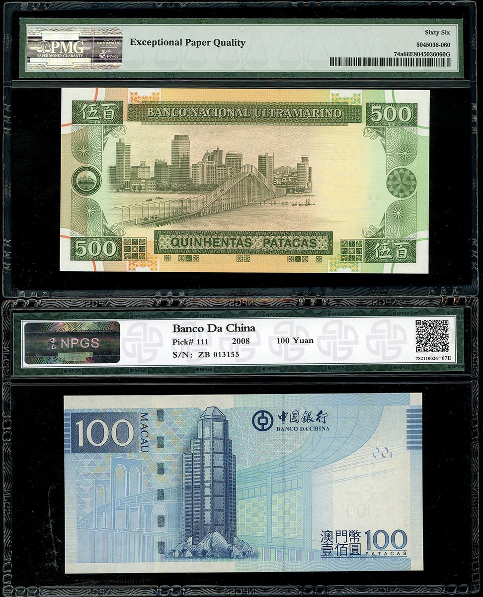 澳門紙鈔一組4枚,包括年大西洋銀行1963年10元、1996年20元及1999年500元,及中國銀行2008年100元,編號5506723, CQ010697, MA90671 及 ZB013155,分別評PMG 64, ACG 67EPQ, PMG 66EPQ 及 NPGS 67EPQ,最後一枚左上有微黃