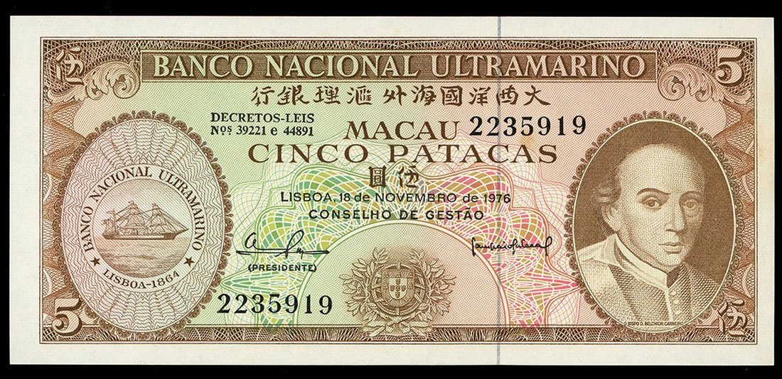 Macau, group of 3 notes, 5 patacas, 18.11.1976, serial number 2235919, 10 patacas, Grand Prix, 1988, serial number KP07492 and 50 patacas, 8.8.1981, serial number KJ54878,