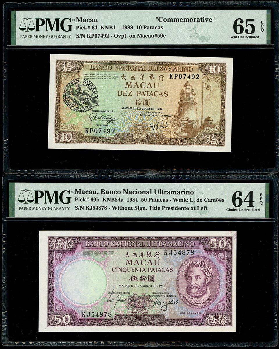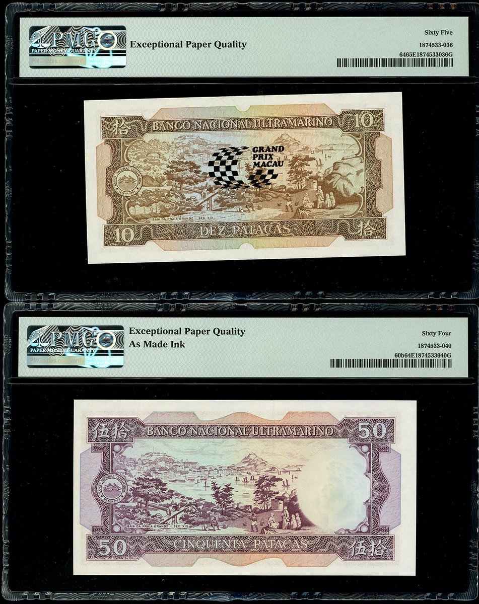 澳門紙鈔一組3枚,1976年5元、1988年賽車版10元及1981年50元,編號2235919、KP07492及KJ54878, 分別UNC有黃,PMG 65EPQ及64EPQ