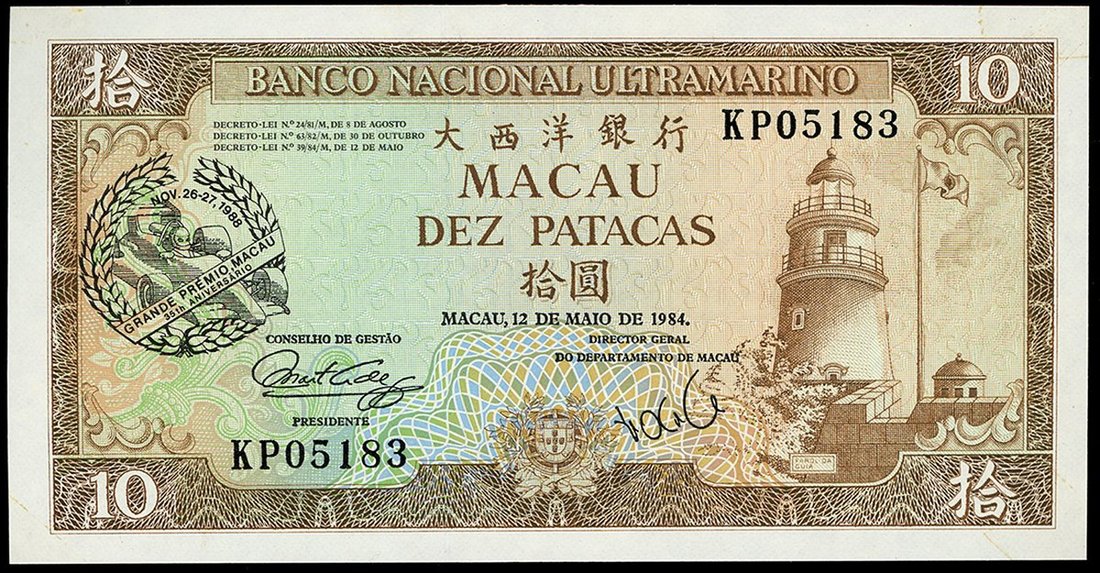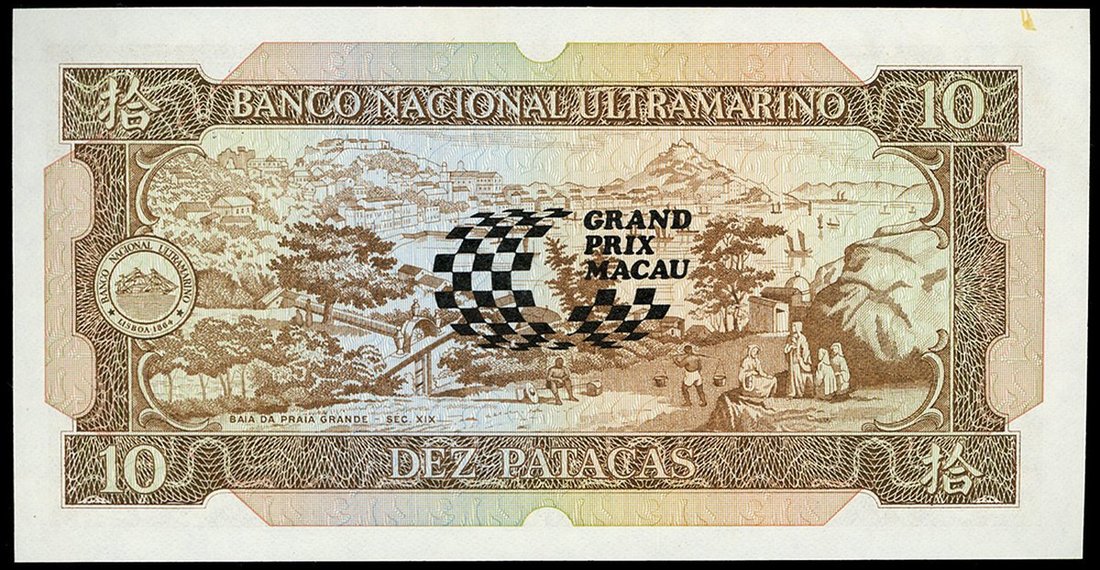 Macau: Banco Nacional Ultramarino, 10 patacas, 1988, serial number KP05183, Grand Prix,