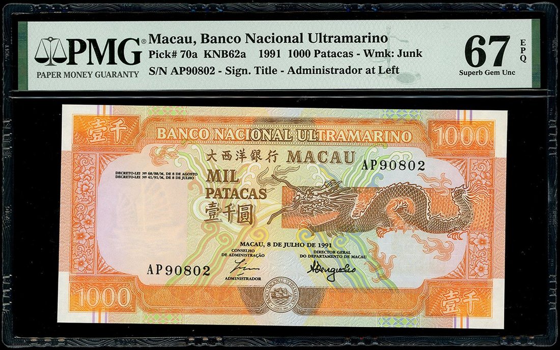 Macau: Banco Nacional Ultramarino, 1000 Patacas, 8.7.1991, serial number AP90802, (Pick 70a), PMG 67EPQ Superb Gem Uncirculated