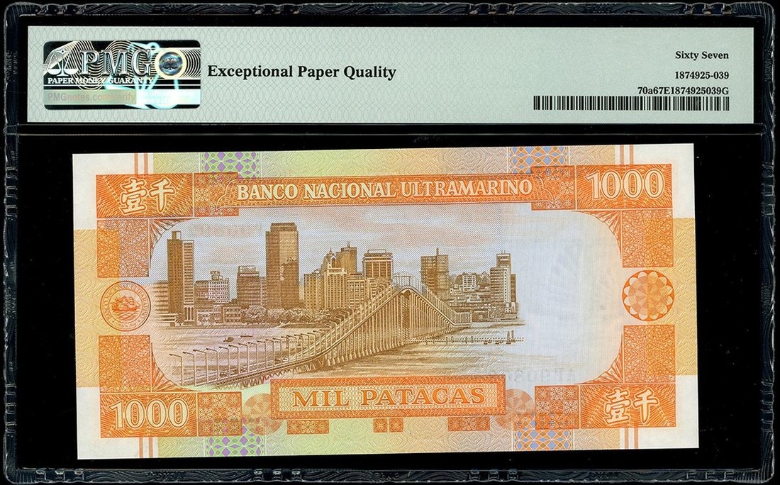 1991年澳門大西洋銀行1000元,編號AP90802,PMG 67EPQ