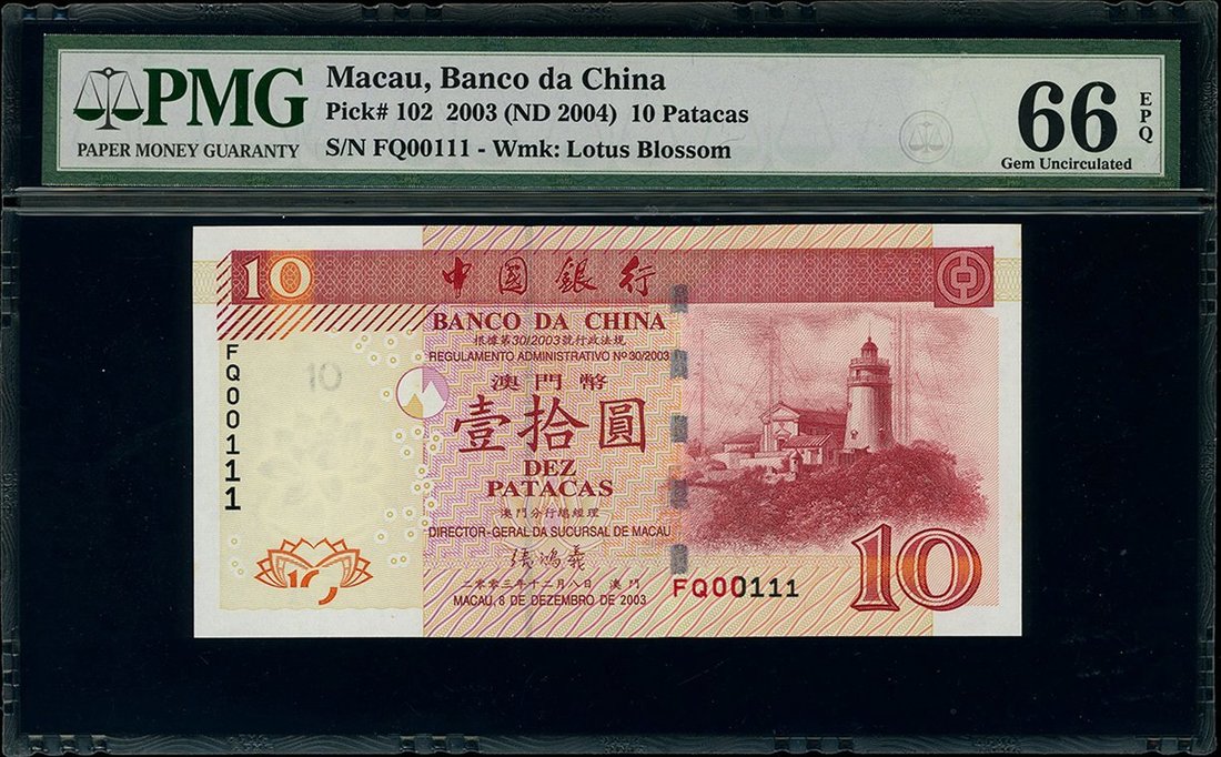 Macau: Banco Da China, 10 Patacas, 8.12.2003, fancy serial number FQ00111, (Pick 102), PMG 66EPQ Gem Uncirculated
