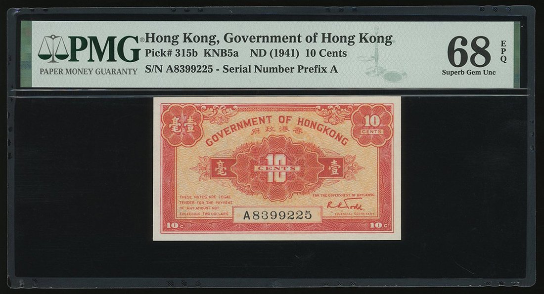 Government of Hong Kong, 10 cents, ND (1941), serial number A8399225, (Pick 315b), PMG 68EPQ Superb Gem Uncirculated
