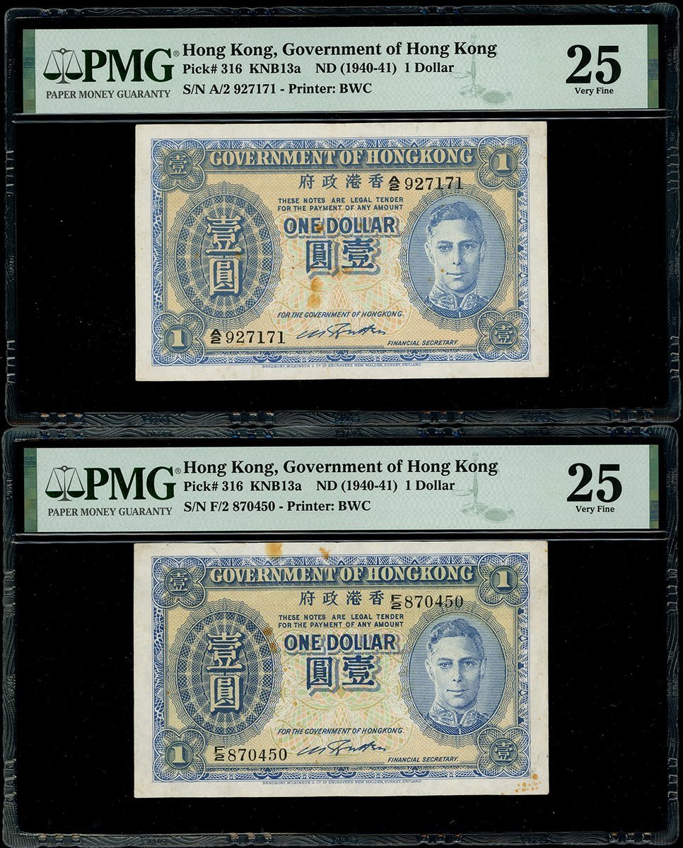 Government of Hongkong, a pair of $1, ND (1940-1941), serial numbers A/2 927171 and F/2 870450, (Pick 316), both graded PMG 25 Very Fine (Rust) (2)