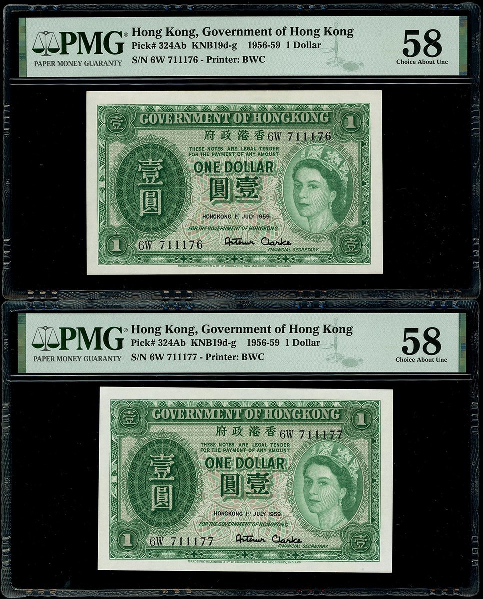 Government of Hongkong, a consecutive pair of $1, 1.7.1959, serial numbers 6W 711176-177, (Pick 324Ab), both graded PMG 58 Choice About Uncirculated (2)