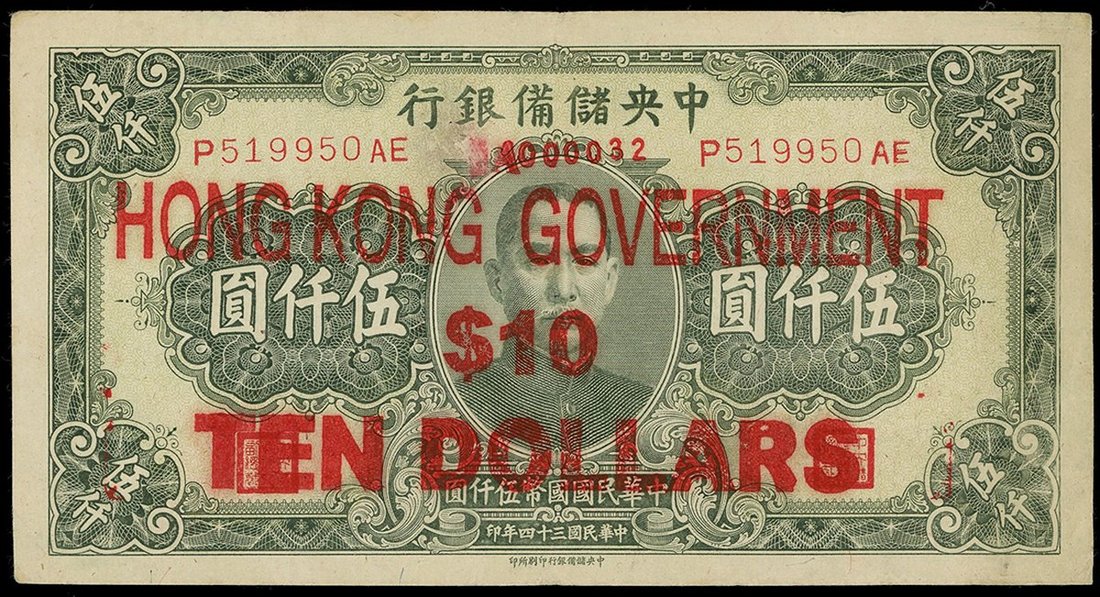 香港政府10元加蓋於1945年中央儲備銀行5000元,無日期,僞造加蓋老假票,編號A000032,VF
