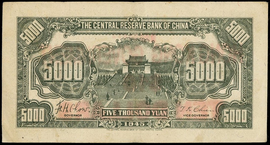 Hong Kong Government, $10 emergency issue, ND (1945), FRAUDULENT OVERPRINT, serial number A000032, overprinted on Central Reserve Bank of China 5000 Yuan, very fine
