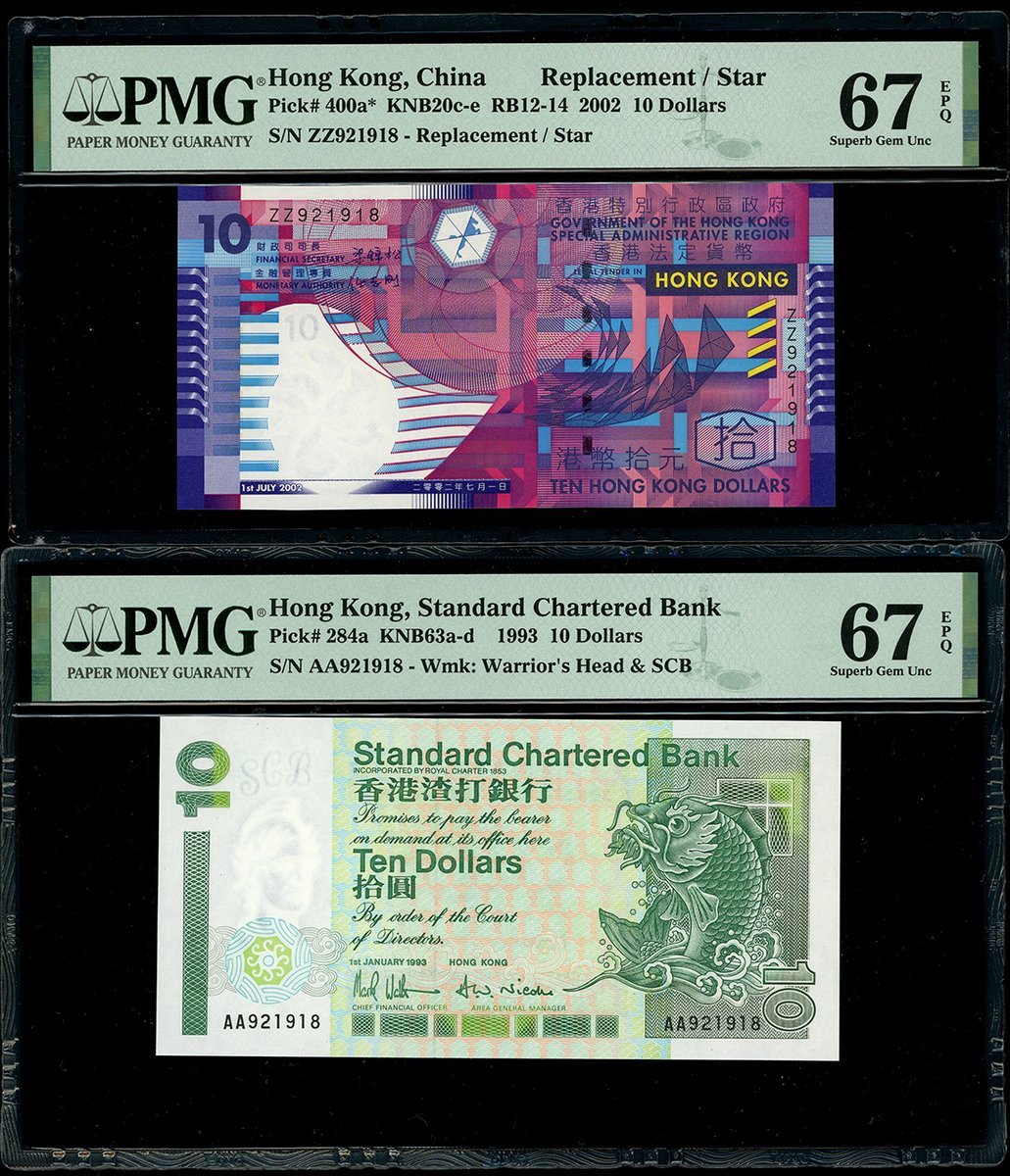 2002年香港政府10元,及1993年渣打銀行10元,相同編號921918,分別補版ZZ及頭版AA字軌,均PMG 67EPQ