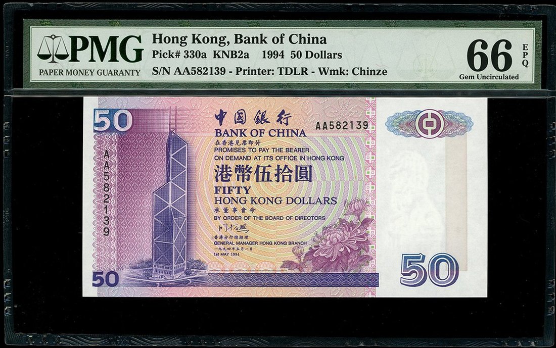 Bank of China, $50, 1994, serial number AA582139, (Pick 330a), PMG 66EPQ, gem uncirculated.