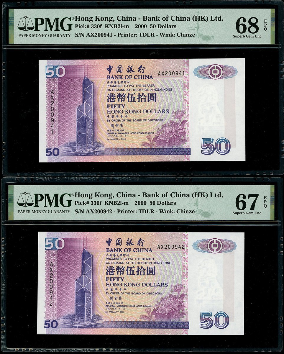 Bank of China, a pair of $50, 1.1.2000, consecutive serial numbers AX200941-942, (Pick 330f), graded PMG 68EPQ and 67EPQ respectively (2)