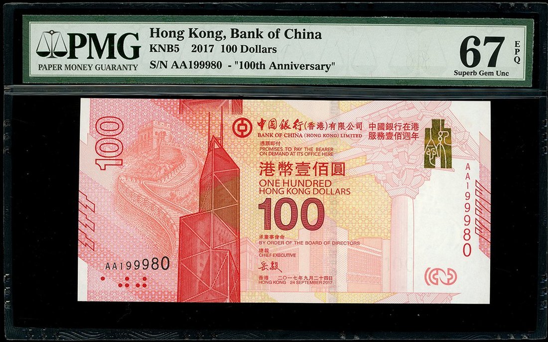 2017年中國銀行100元,在港服務一百週年紀念鈔,編號AA199980,PMG 67EPQ