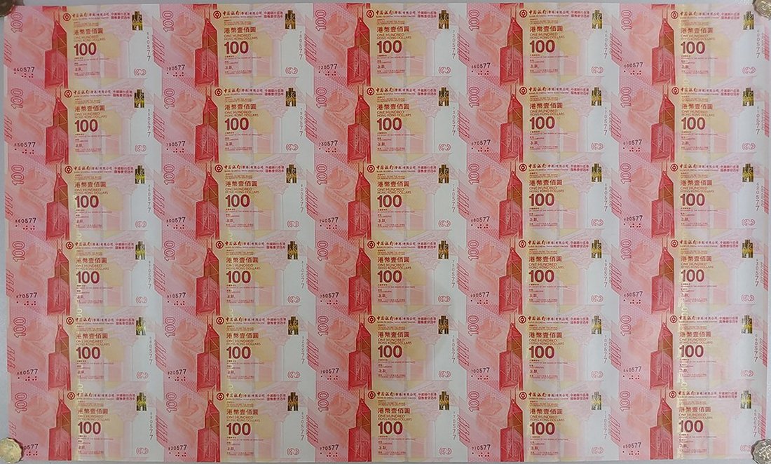 Bank of China, an uncut sheet of 30x $100, 24.9.2017, 100th anniversary of the Bank in Hong Kong, serial number ending in 577,