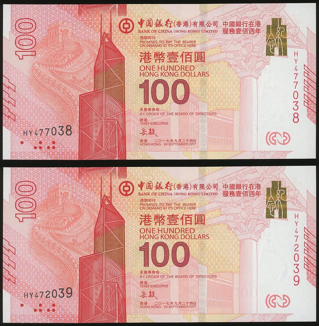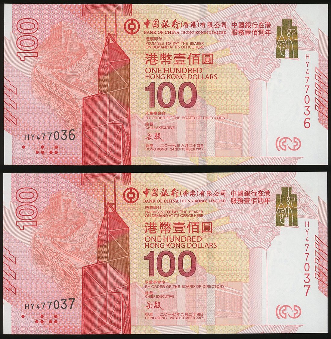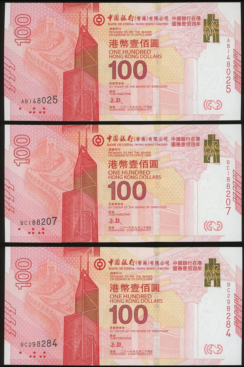 Bank of China, 10x $100, 24.9.2017, 100th anniversary of the Bank in Hong Kong, serial numbers without prefix, 895493, 785405, 895494, and serial numbers with prefix, AB148025, BC188207, BC298284 and HY472036-39,