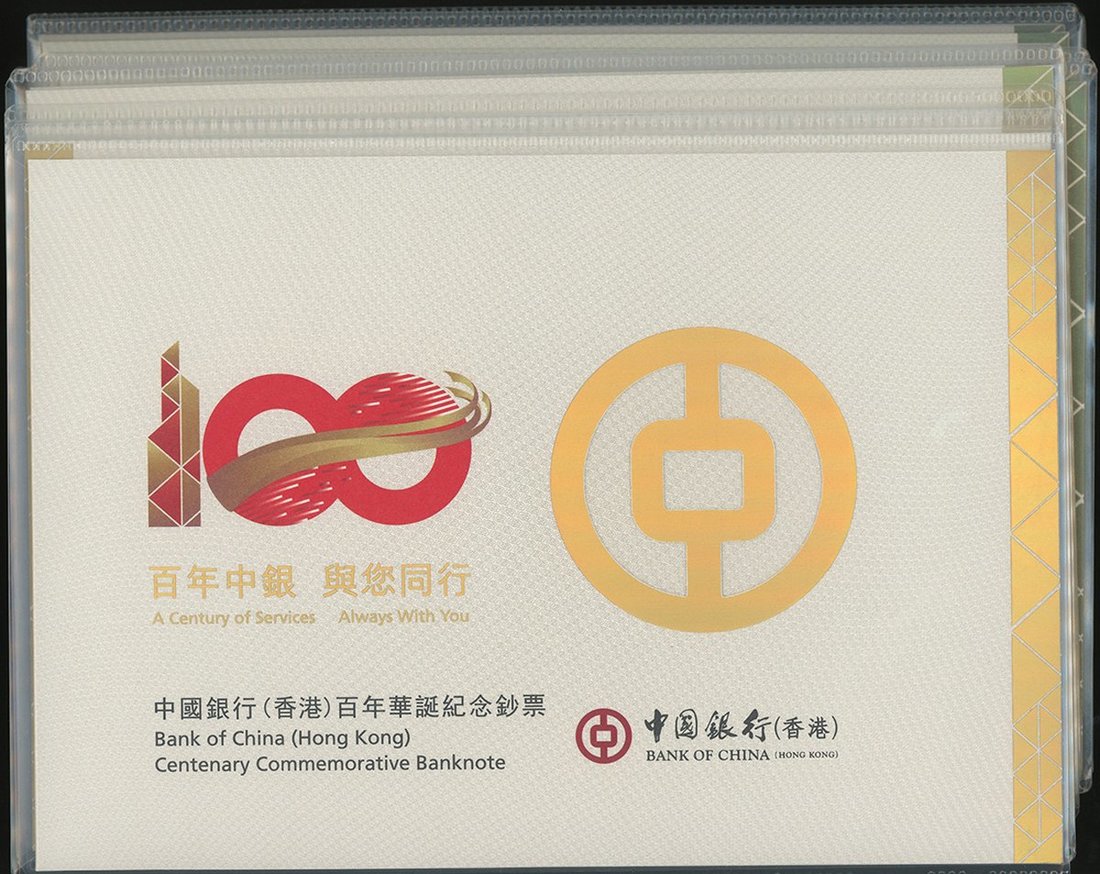 2017年中國銀行在港服務一百週年100元紀念鈔一組10枚,包括3枚無字軌編號895493, 785405, 895494,及7枚帶字軌AB148025, BC188207, BC298284 及 HY472036-39,UNC,連原包裝