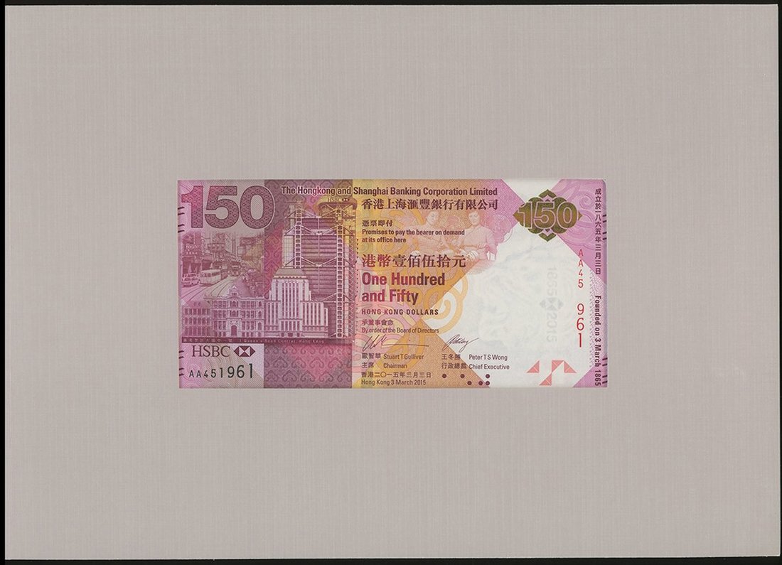 Hong Kong Commemoratives, BOC, $100, 2017, 100th anniversary of the Bank in Hong Kong, serial number BC635087, and HSBC, $150, 2015, 150th anniversary of the Bank, serial number AA451961,