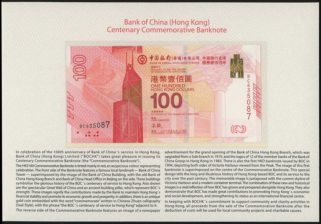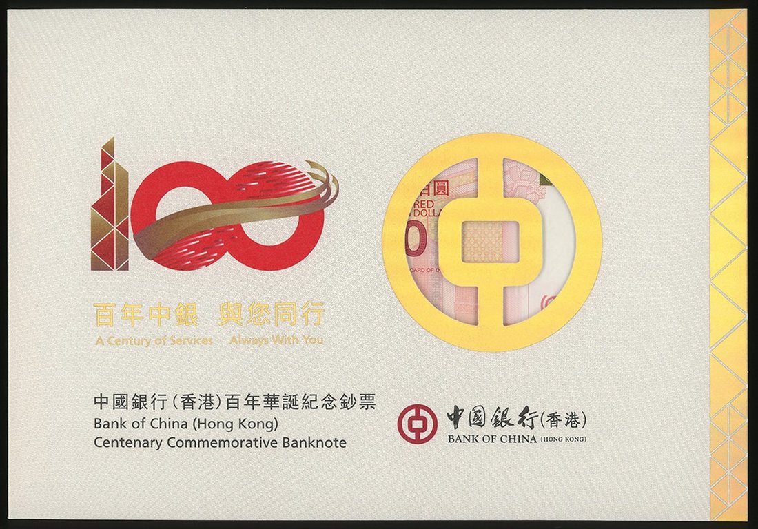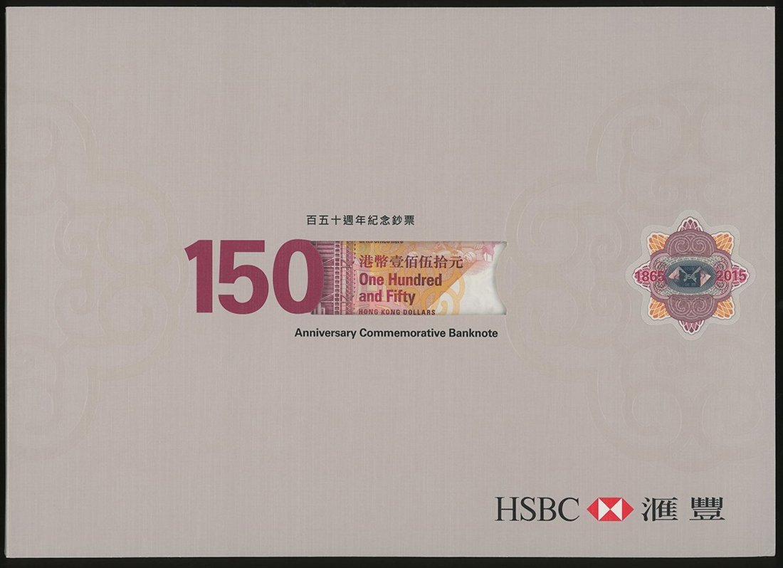2017年中國銀行在港服務一百週年100元紀念鈔,編號 BC635087,及2015年匯豐銀行成立150週年150元紀念鈔,編號AA451961,及UNC,均連原封套