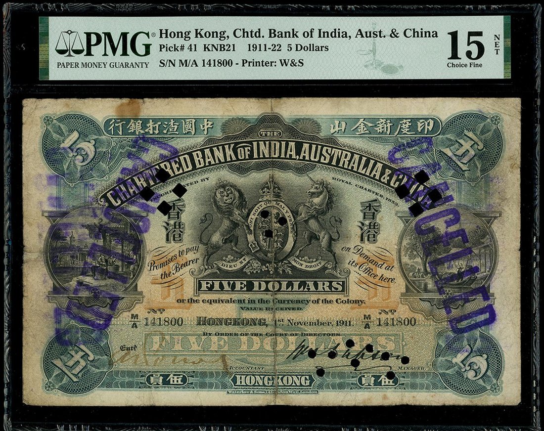 The Chartered Bank of India, Australia and China, $5, CANCELLED, 1.1.1911, serial number M/A 141800, hole punched and stamped 'CANCELLED',