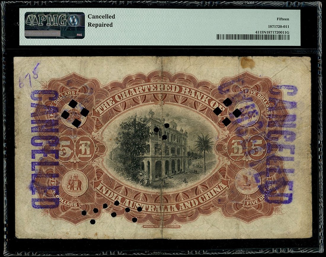 1911年印度新金山中國渣打銀行5元注銷票,編號M/A 141800,打孔注銷,PMG 15NET,有修補,罕見首發年份
