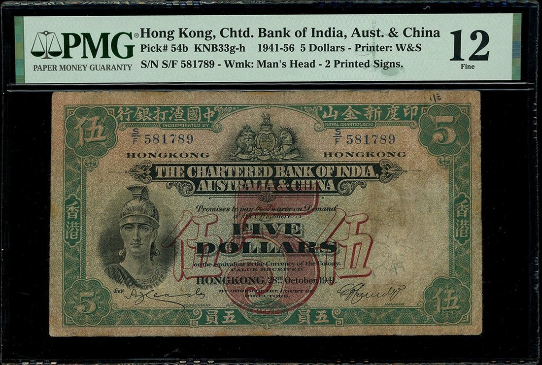 The Chartered Bank of India, Australia and China, $5, 28.10.1941, serial number S/F 581789, (Pick 54b), PMG 12 Fine (Repaired)