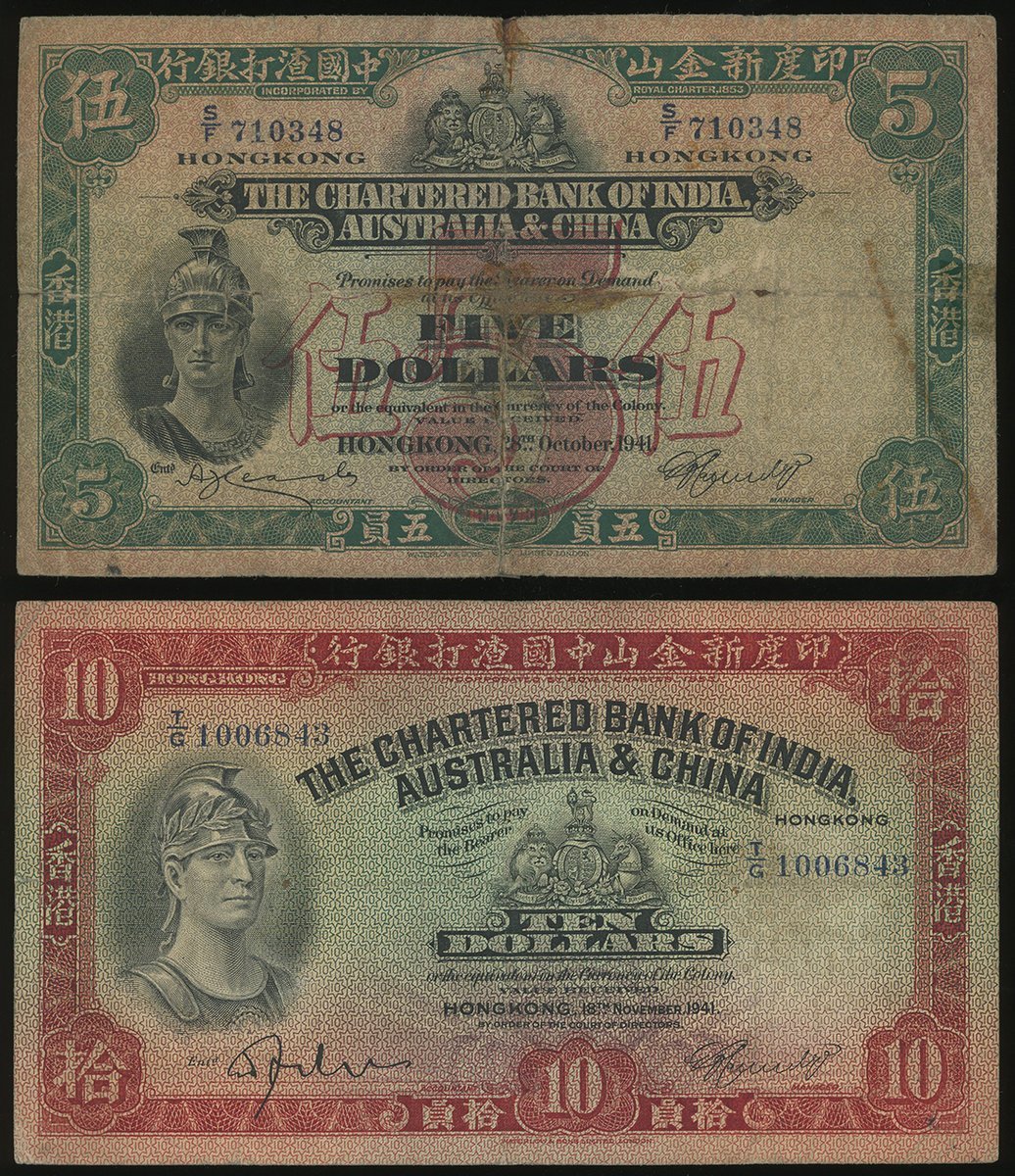 The Chartered Bank of India, Australia and China, pair of $5 and $10, both dated 1941, serial numbers S/F 710348 and T/G 1006843 respectively, green and red respectively, helmeted Roman solider at left,