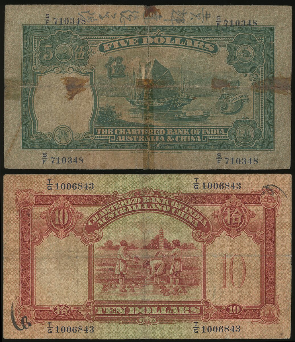 1941年印度新金山中國渣打銀行5元及10元一對,編號S/F 710348 及 T/G 1006843,前者G品相,有膠帶修補及書寫,後者AF,背面有書寫