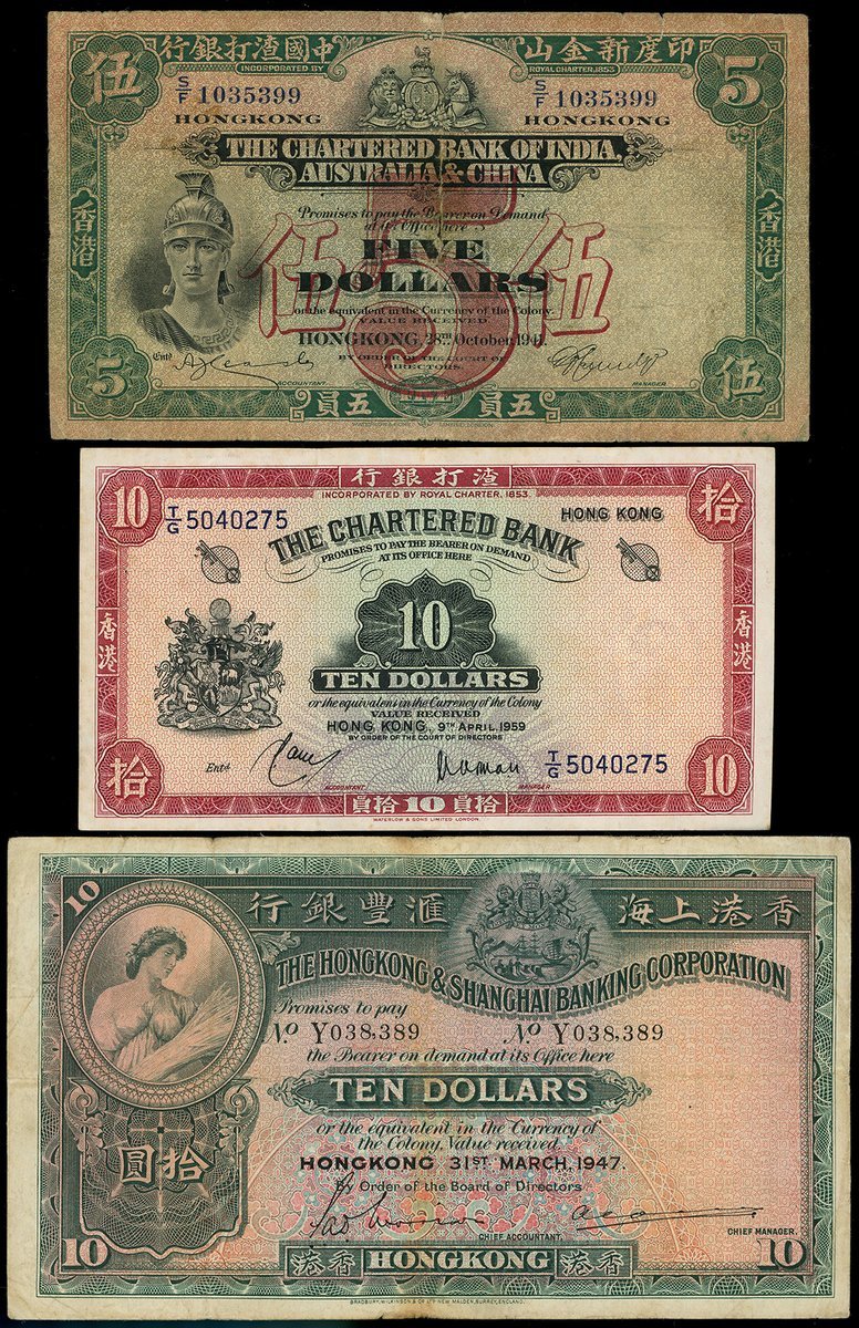 The Chartered Bank of India, Australia and China, $5, 28.10.1941, S/F 1035399, $10, 9.4.1959, T/G 5040275 and HSBC, $10, 31.3.1947, Y038389,