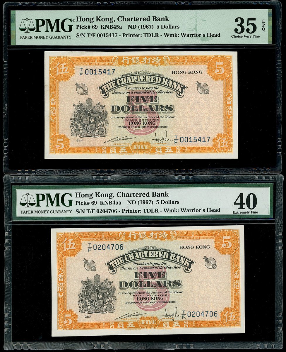 1967年渣打銀行5元一對,無日期,編號T/F 0015417 及 T/F 0204706,分別評PMG 35EPQ 及40