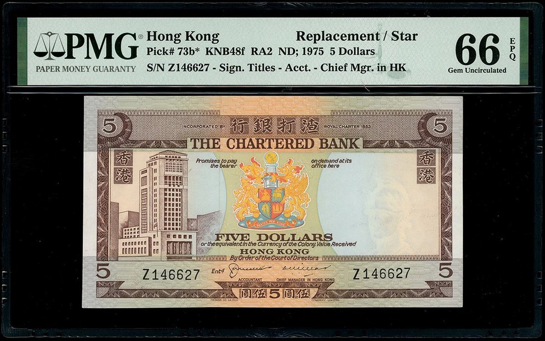 1970-75年渣打銀行5元,無日期,補號 Z146627,PMG 66EPQ