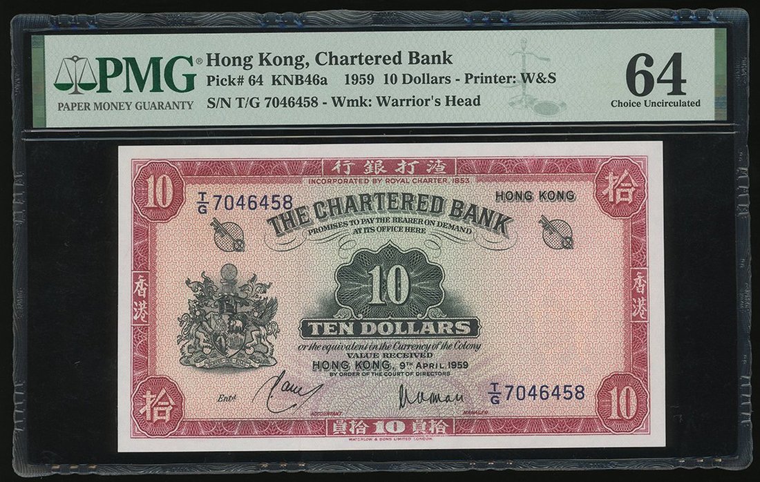 The Chartered Bank, $10, 9.4.1959, serial number T/G 7046458, (Pick 64), PMG 64 Choice Uncirculated