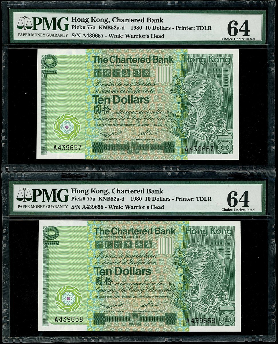 1980年渣打銀行10元連號2枚,編號A439657-658,均PMG 64