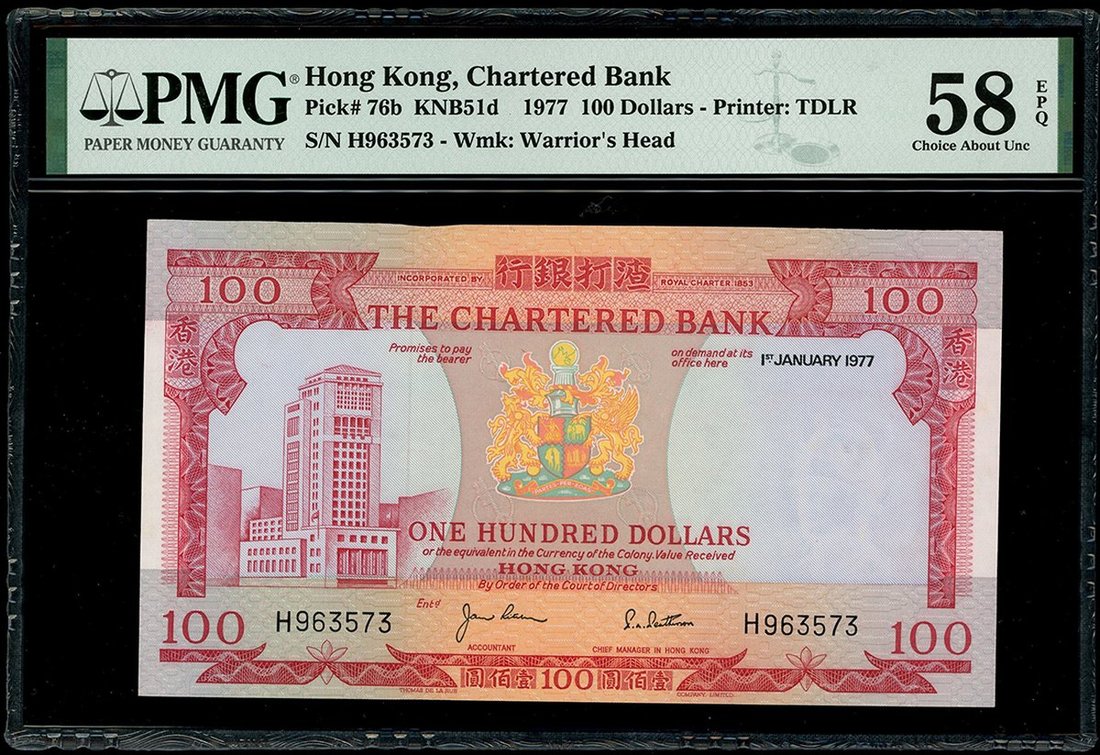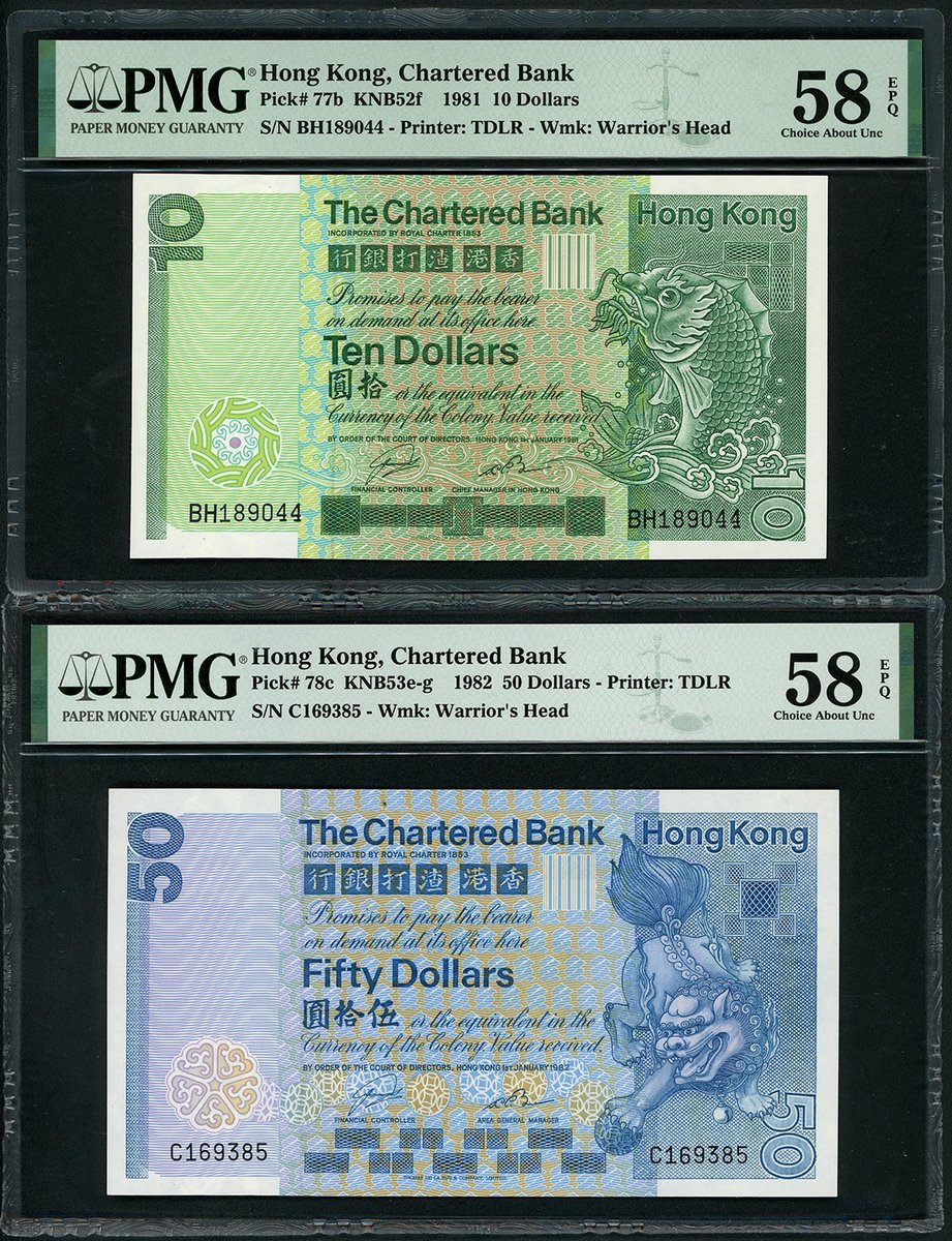 渣打銀行一組3枚,1981年10元、1982年50元及1977年100元,編號 BH189044, C169385 及 H963573,均評PMG 58EPQ