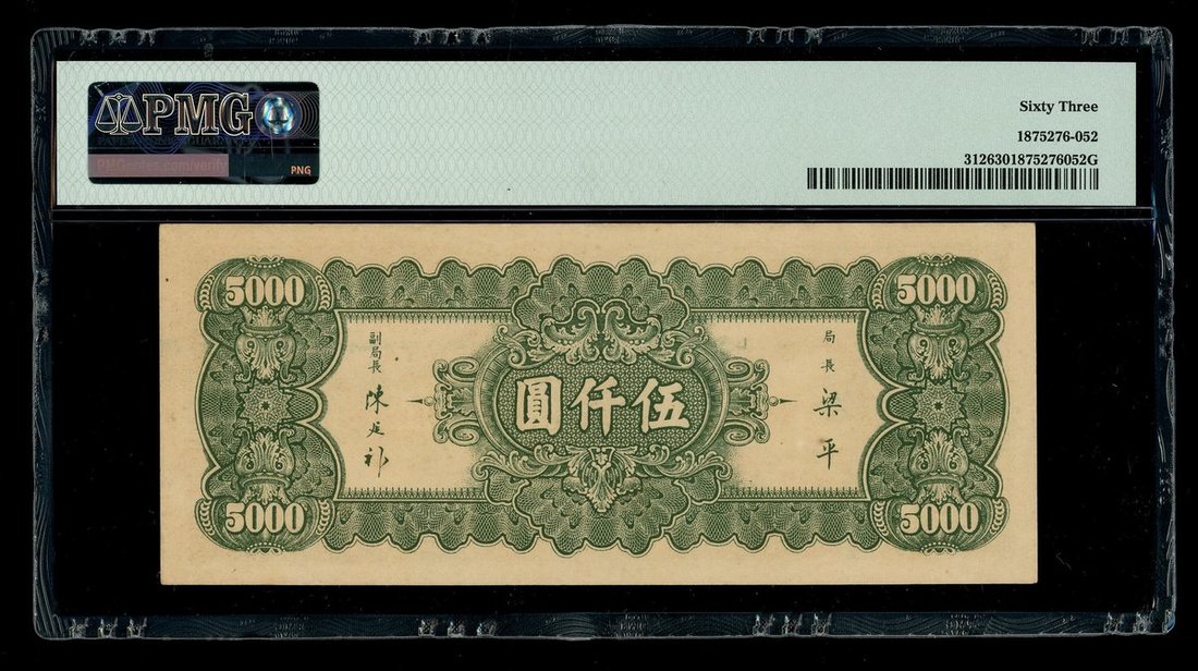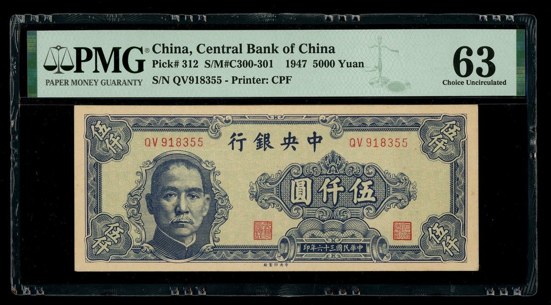 1947年中央銀行5000元,編號QV 918355,PMG 63