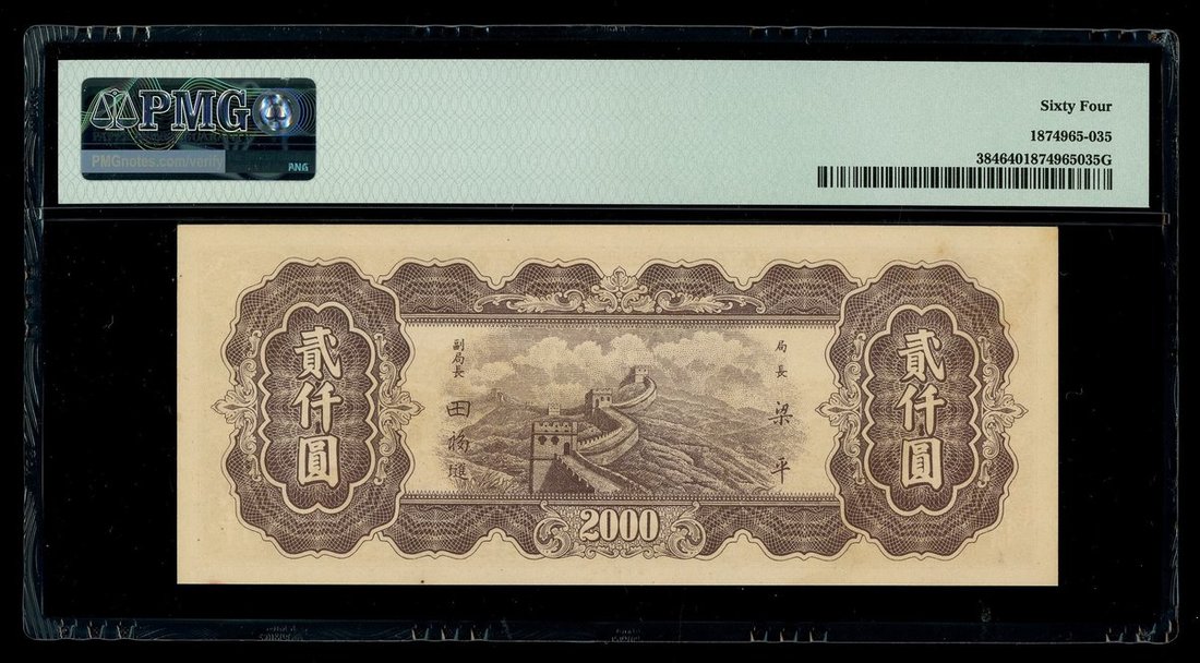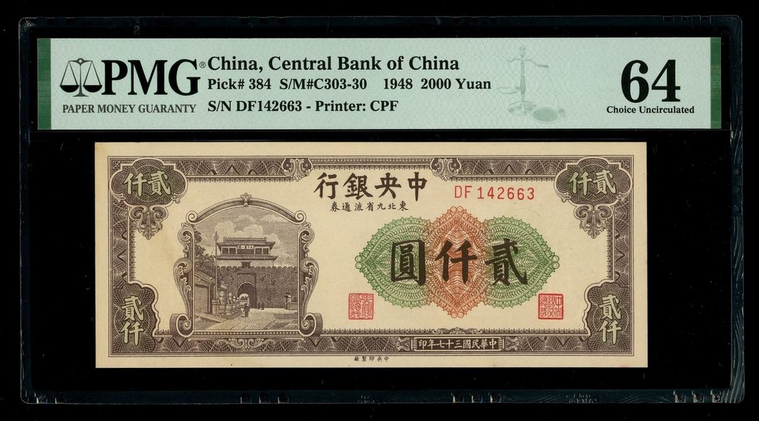 民國三十七年中央銀行東北九省流通券2000元,編號DF142663,PMG 64