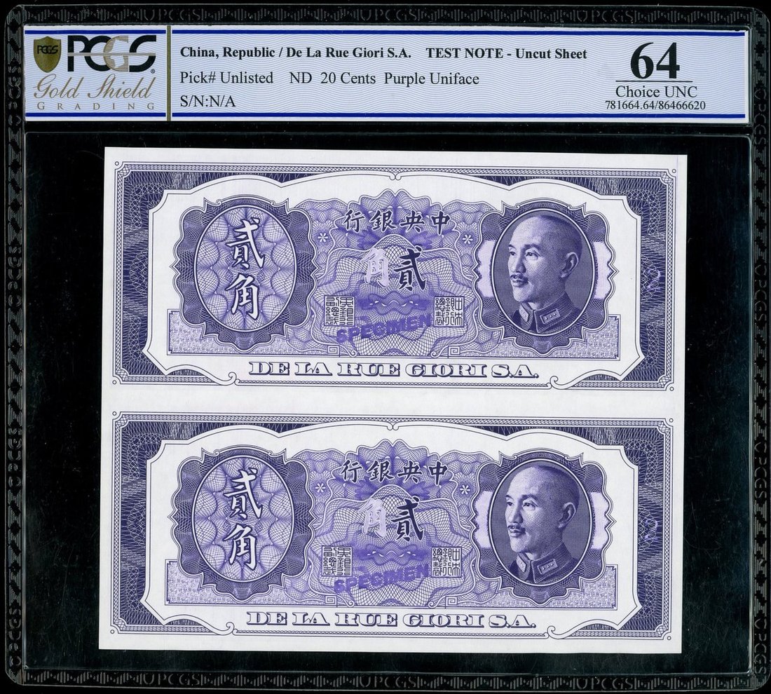 Central Bank of China, 20 cents, test notes, uncut pair, printed by De la Rue Giori S.A.,