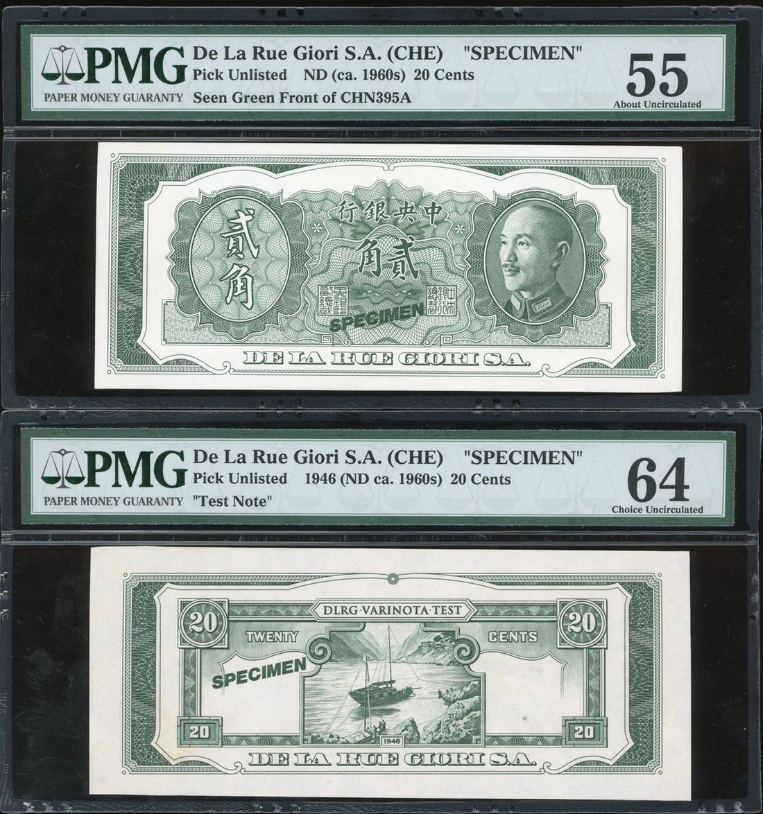 Central Bank of China, lot of 2 individual pieces, the first a uniface obverse design in green for 20 cents of the Gold Yuan issue, and the second depicting the reverse design in green on one side and black on the other, printed De La Rue Giori S.A. (CHE), (Pick Unlisted but type of 395A and 396), PMG 55 About Uncirculated for the obverse and 64 Choice Uncirculated for the reverse (1 pair)