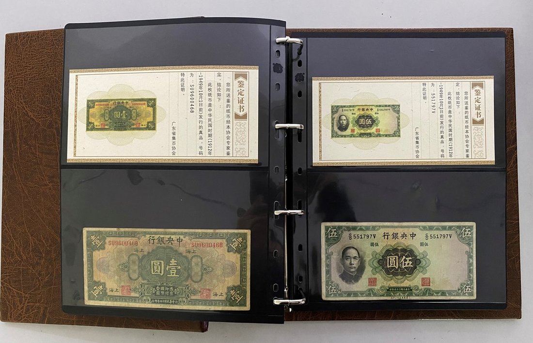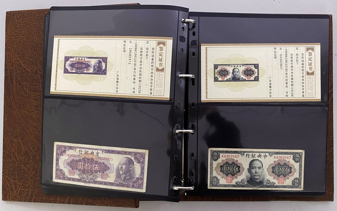 民國紙幣一冊子100枚,包括中央銀行,廣東省銀行,海南銀行等,均附廣東省集幣協會證書,品相不一