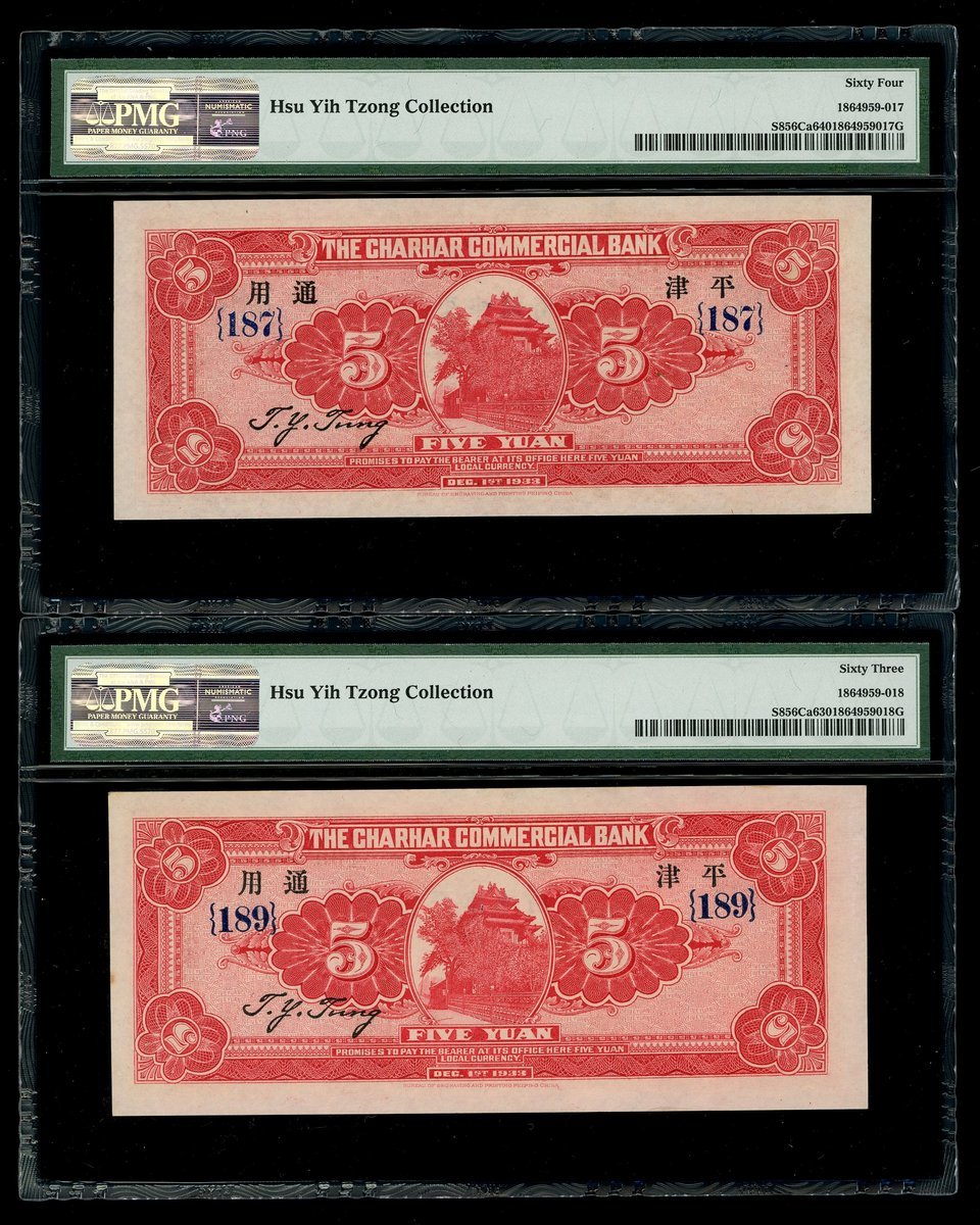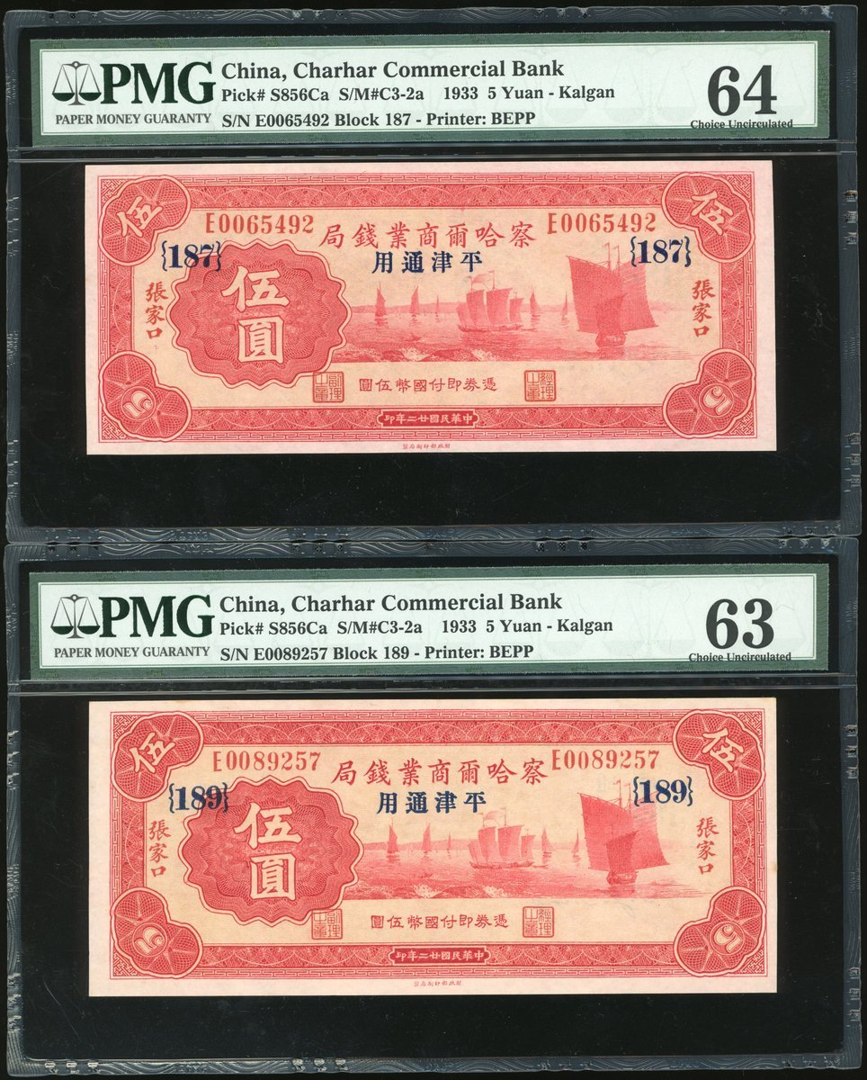 Charhar Commerical Bank, lot of 2x 5 yuan, 1933, Kalgan, serial number E0065492 and E0089257, (Pick S856Ca), graded PMG 64 and 63 respectively (2)