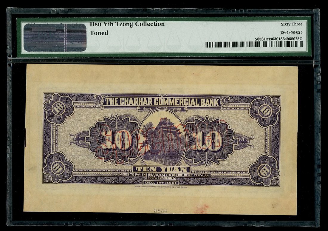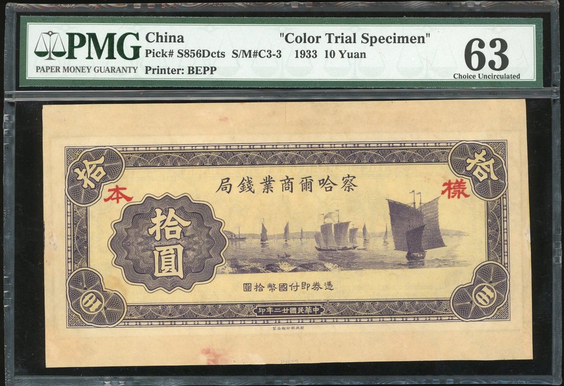 Charhar Commercial Bank, 10 yuan, colour trial specimen in purple, 1933, purple on yellow paper, sailing junks at right, denomination at each corner, reverse in similar colours, Chinese style house at centre, English text, printed by the Bureau of Engraving and Printing, Peiping, China, (Pick S856Dcts), PMG 63 Choice Uncirculated and very rare