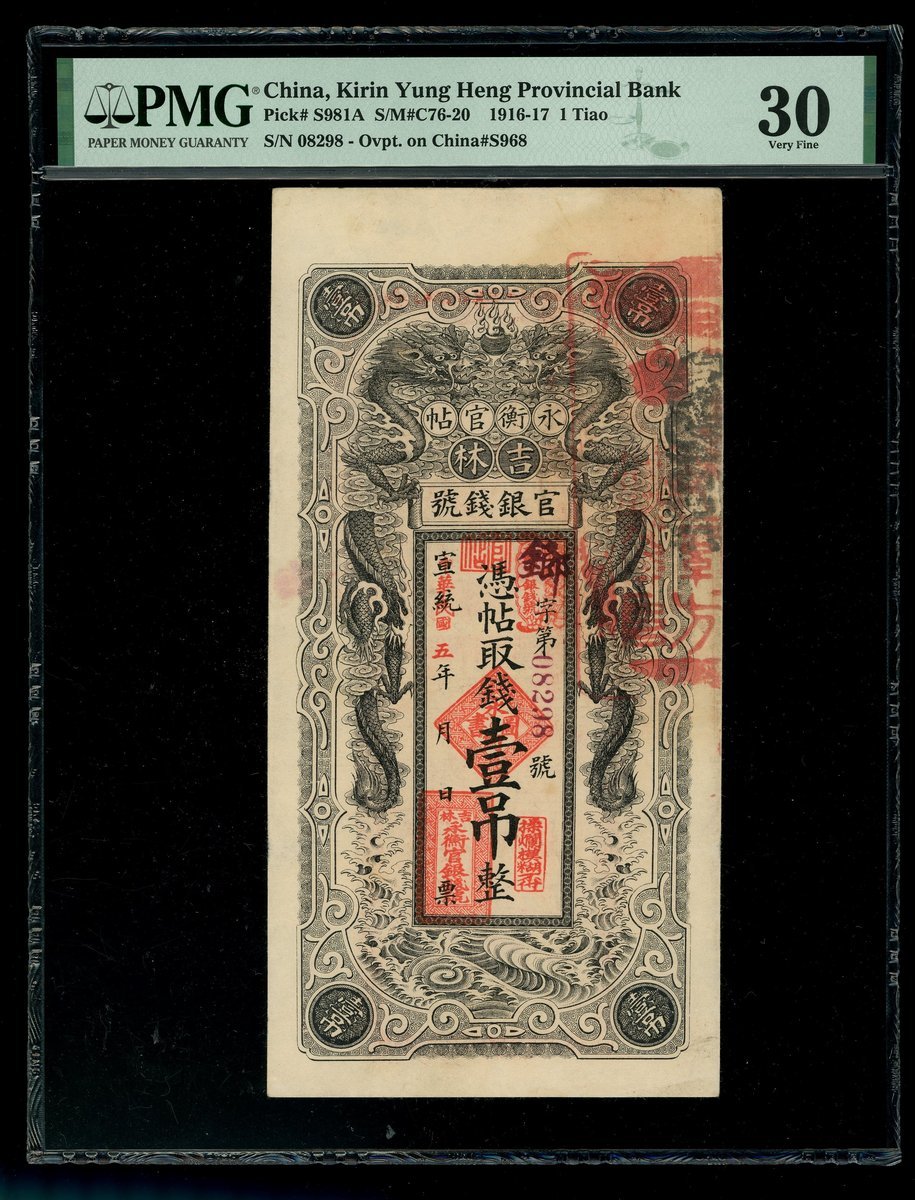 Kirin Yung Heng Provincial Bank, 1 tiao, 1916, overprinted on Xuantong era note, serial number 08298, (Pick S981A), PMG 30 Very Fine (Minor Restoration)
