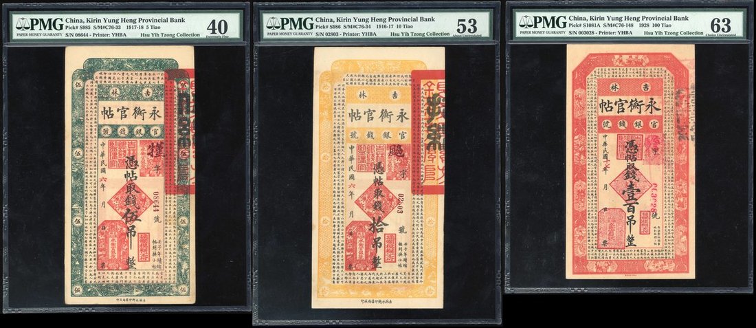 Kirin Yung Heng Provincial Bank, group of 3 notes consisting of: 5 tiao, 1917, serial number 08644, 10 tiao 1917, serial number b02803 and 100 tiao, 1928, serial number 003028, (Pick S985, S986 and S1081A), graded PMG 40, 53 and 63 respectively (3)