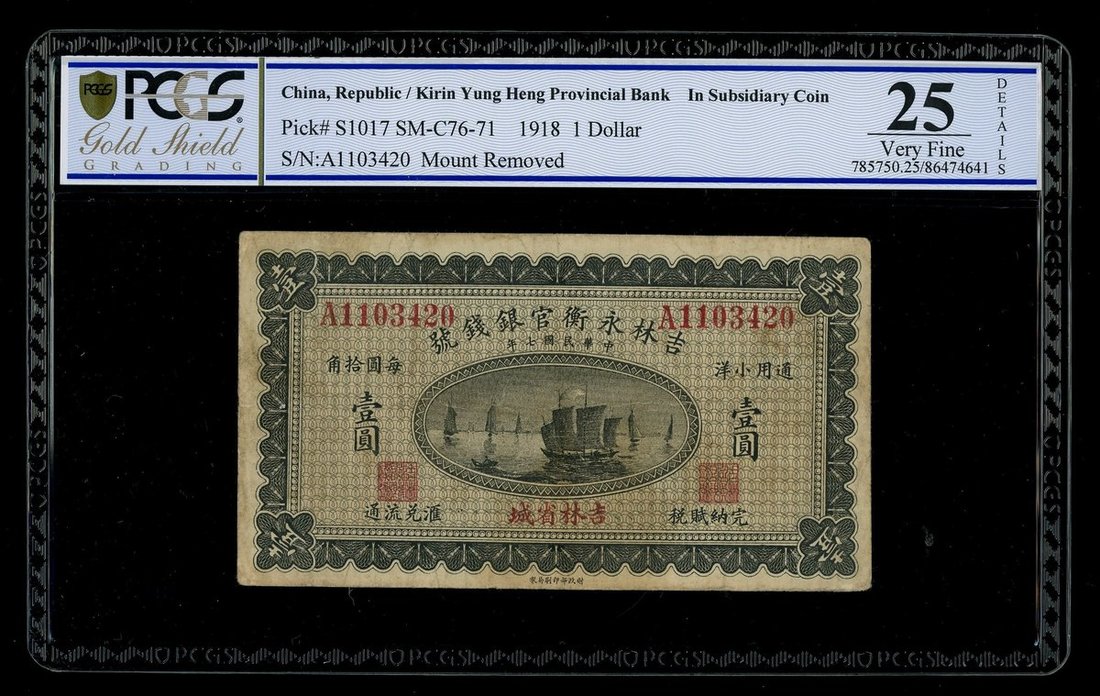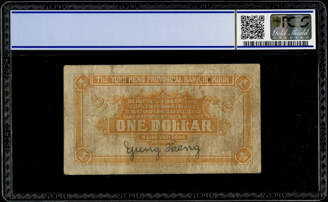 Kirin Yung Heng Bank, $1, 1918, serial number A1103420, (Pick S1017), PCGS Gold Shield 25 Details (Mount Removed)