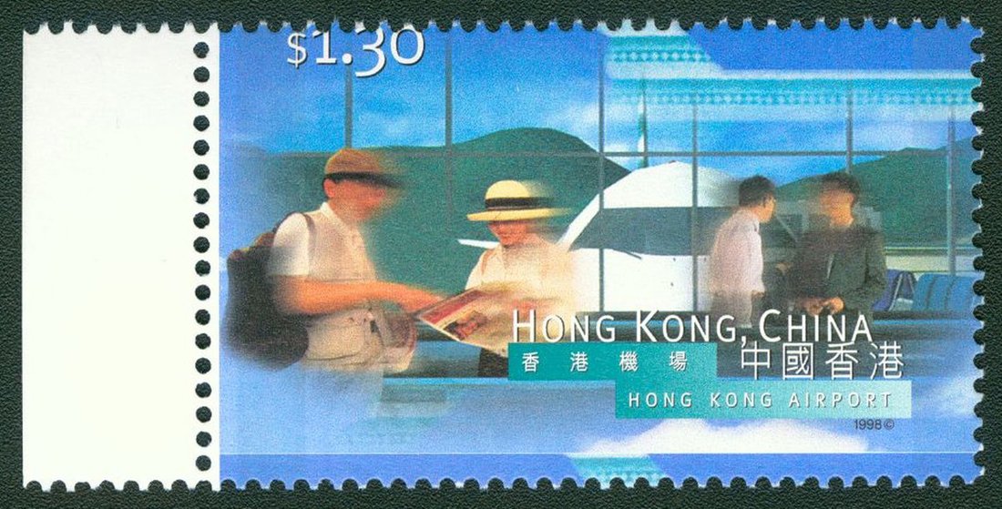 1998 Hong Kong International Airport $1.30 with left margin, variety perforations shifted downward 2mm, unmounted mint, very fresh.