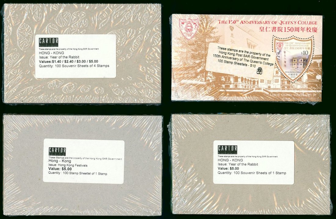 2011 Year of Rabbit miniature sheet, 4 values in one sheet (100) and $5 (100); 2012 The 150th Anniv. of Queen's College $10 miniature sheet (100) and Hong Kong Festival $5 miniature sheet (100).