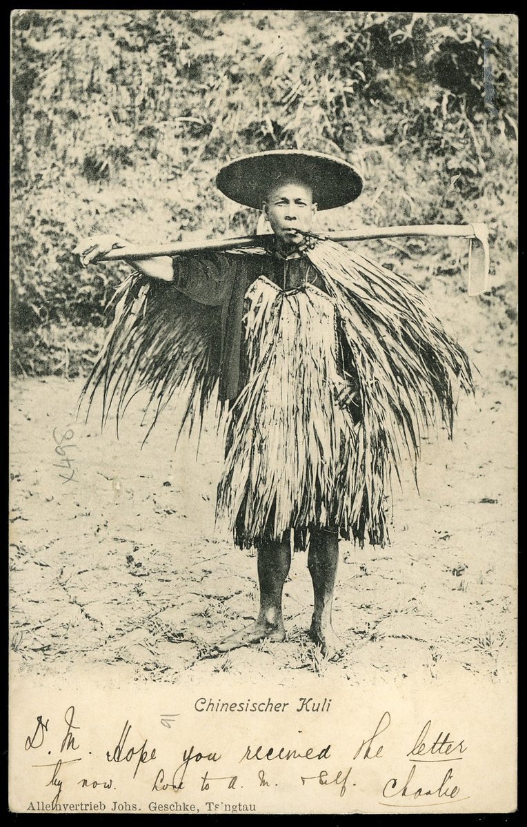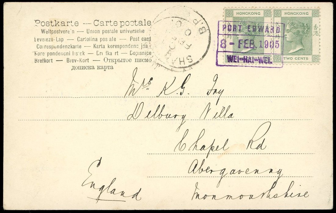 1905 (8 Feb,) picture post card to Abergavenny bearing pair of Q.V. 2c. green tied by a fine strike of the boxed type F datestamp in violet with Shanghai B.P.O. c.d.s. alongside. Clean and fine