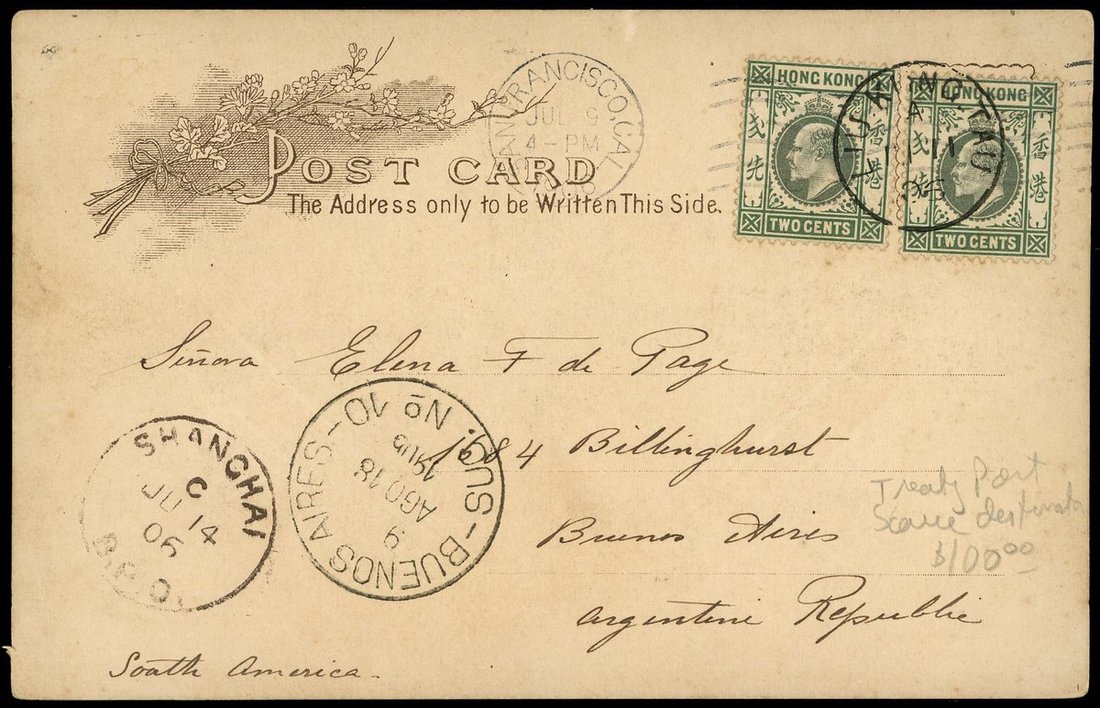 1906 (11 June) picture post card to Argentina bearing 4c, franking tied by the 22mm type B c.d.s. and San Francisco (9.7) machine postmark, with Shanghai B.P.O. (14.6) and Buenos Ayres arrival c.d.s. (18.8). A good card.