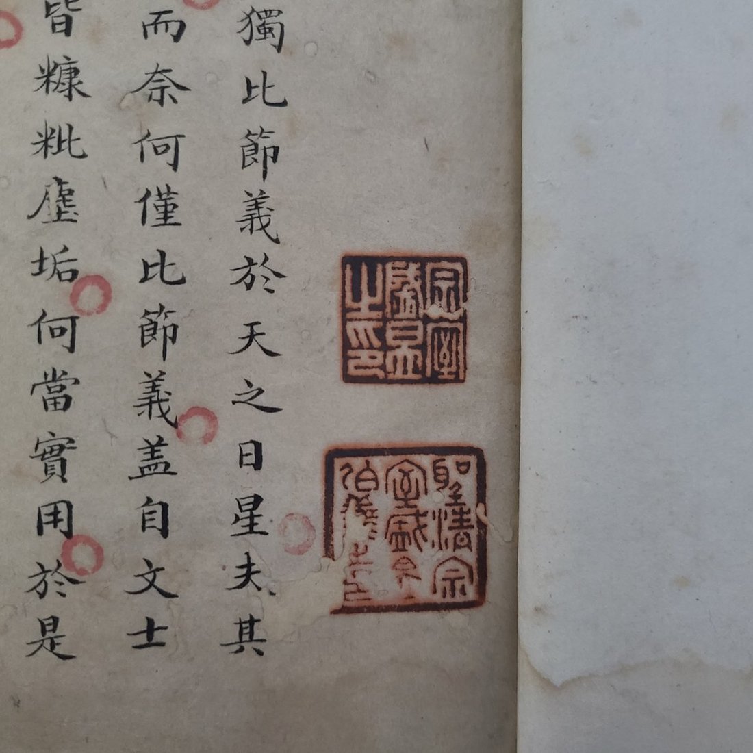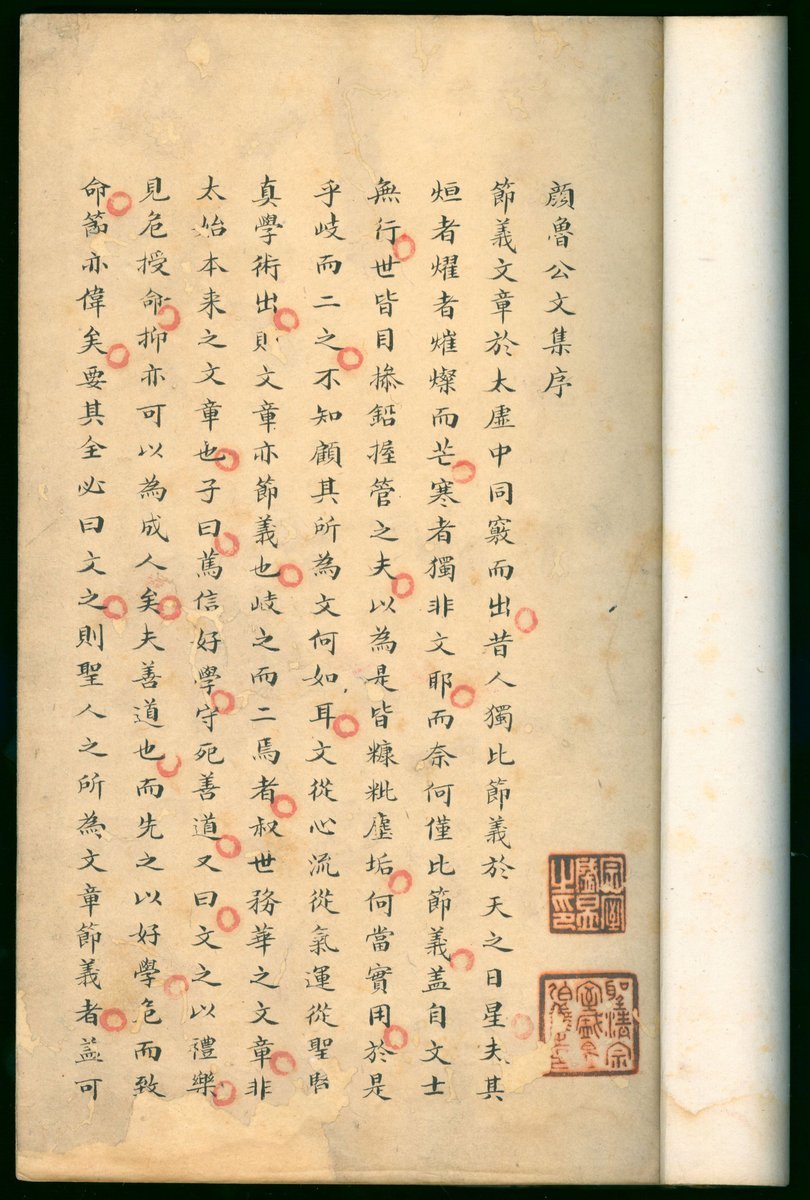 1616-1912年清抄本"顏魯公文集", 十五卷四册, 線裝, 四角包錦布, 全書以工整秀逸之楷書抄寫, 書的下端有輕微水漬. 此本為清宗室遠支盛昱 (1850-1900) 舊藏, 鈐印两枚: 白文 "宗室盛昱之印", 朱文 "聖清宗室盛昱伯羲之印". 查盛昱曾祖父為肅恭親王永錫, 其七世祖肅武親王豪格(1609年-1648) 乃清太宗文皇帝第一子. 盛昱愛藏書, 藏書樓有“意園”, “郁華閣” 等名, 所藏書在民國初年就陸續開始散出. (15.5 x 24.5 cm)